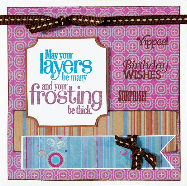 Using the Birthday Greetings Stamp Set, stamp the “May your layers…” greeting on white cardstock using the ocean and blackberry ink pads to ink one section of the greeting and then the other as shown.