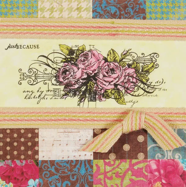 Stamp a Noteworthy large rose bunch stamp on 4 3/4”x2” of white cardstock. Stamp Noteworthy “Just Because” in the top left corner. Heat set with the heat embossing tool.