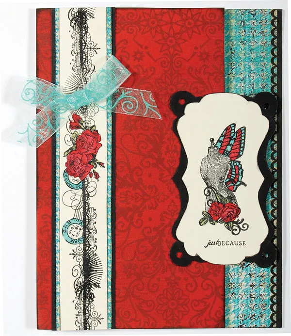 Place the card fold on the side. Cut 1 1/4” from the right side of the card front only. Cover the card front with red patterned paper. Cut a 1”x 6 1/2” strip of ivory paper and stamp a border the length of the strip. Color the roses with the #14 Vermillion pen, the leaves #175 Lime Green and the round cancellation stamp #68 Turquoise Blue. Ink the long edges black and mat with aqua houndstooth paper and black cardstock, leaving 1/8” borders. Glue the stamped border 3/8” from the card fold. Glue an sheer aqua swirl bow above the colored roses.
