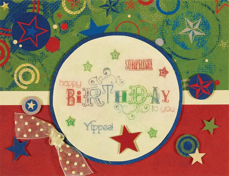 Glue a 6 1/2"x3 1/2" green/red/blue/yellow stars and circles paper across the inside, 1/2" from the bottom. Stamp “Celebrate!” on pale yellow cardstock, heat set the image, then let it cool completely and chalk the image as in step #2 Trim the image into a rectangle, then mat on blue/green dots paper leaving a 1/8” border. Mat again on red textured paper, leaving a 1/4" border. Glue centered to the inside. Cut a circle and star from remaining paper and foam tape them overlapping the mat as shown.