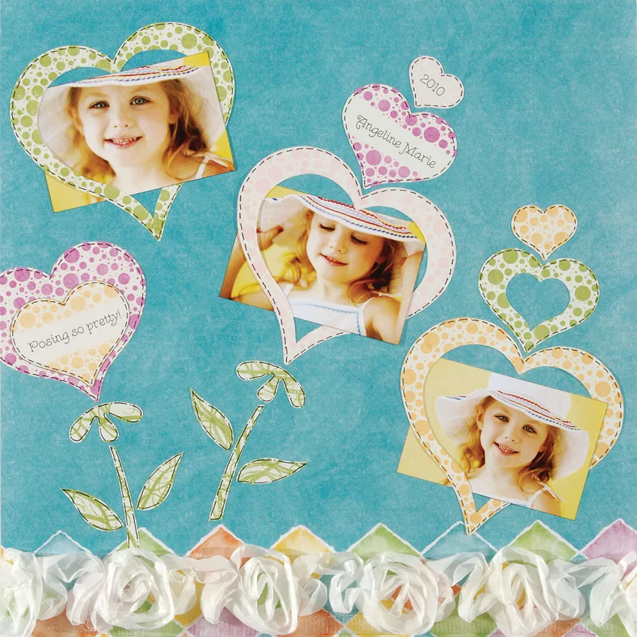 Cut out three 3 ½”x2 ¼” photos and ink the edges black. Glue the first photo in the upper left corner 1” from the top and ¾” from the left, only gluing down the left side of the photo. Take the Bamboo heart and slide the right side of the photo over the edge of the heart so it is overlapping the heart. Glue the heart down, then glue the rest of the photo down. Repeat this with the center photo and the Angel Pink heart, gluing the photo about 4” from the right and top. Glue the heart tilted to the right. Repeat with the bottom right photo and the Cantaloupe heart, tilting the photo and heart slightly to the right.