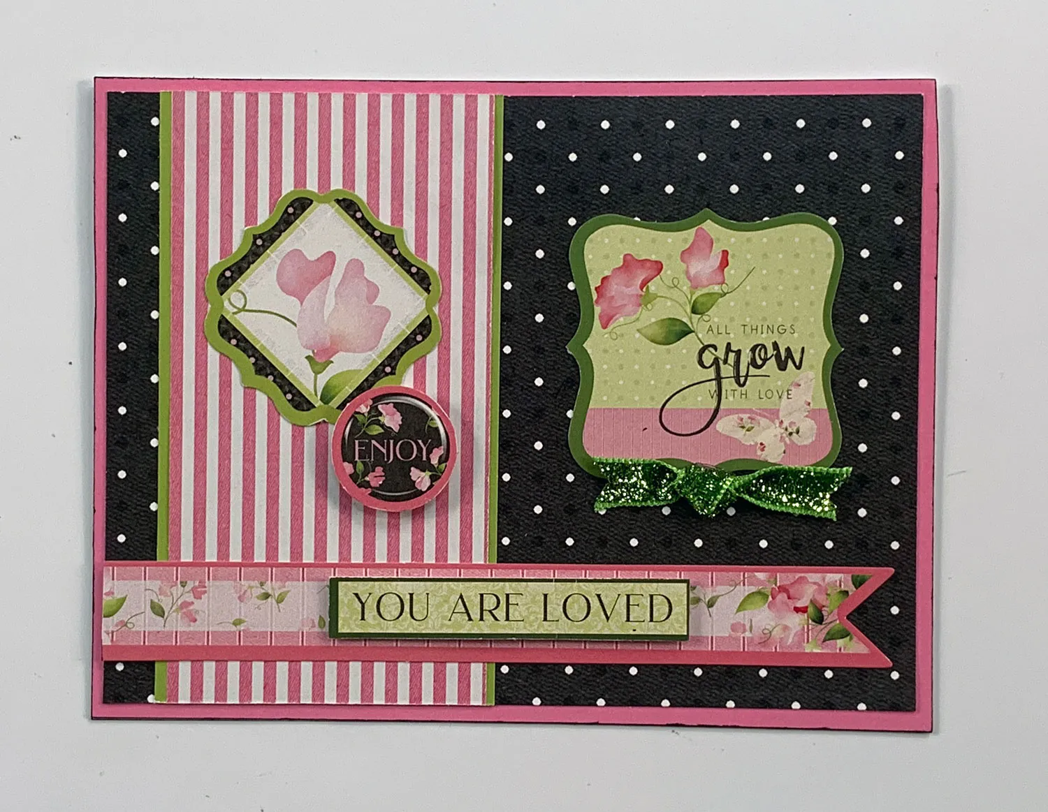 Debbie covered her 6 1/2”x5” card with Sweet Pea Cardstock. She glued 6 ¼”x4 5/8” dotted Cardstock on top. She matted 2 ½”x4 ¾” striped Sweet Pea 6”x6” Patterned Cardstock on lime Cardstock and glued it ½” from the left edge. She glued and foam taped five die-cuts as shown. She Zotted™ a knotted ribbon from the Glitter Ribbon Set as shown.