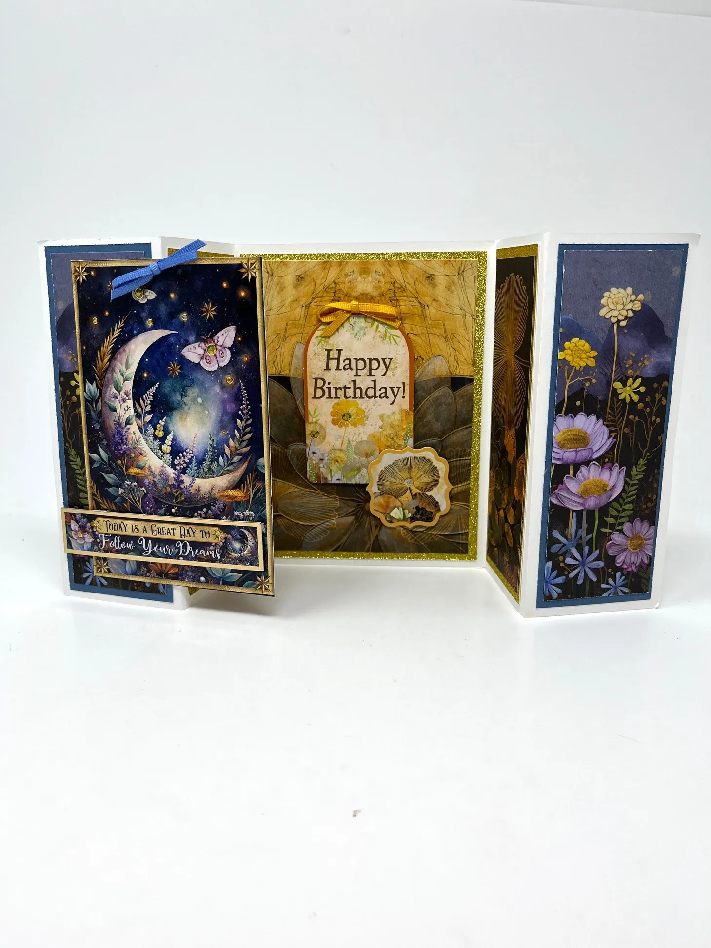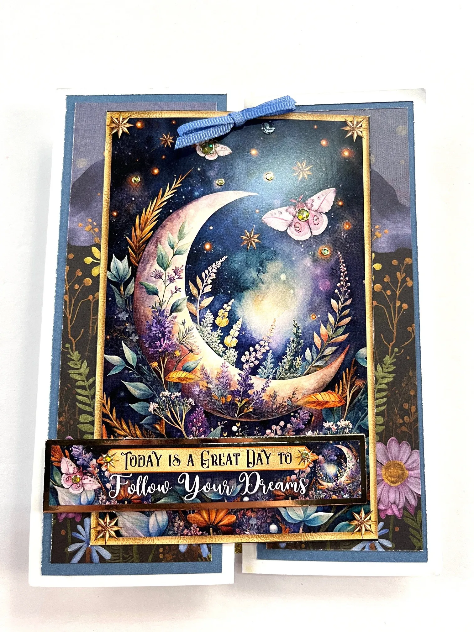 Cut two 2 1/8”x6” blue Golden Botanicals 12x12 Solid Cardstock and tape to both gates leaving 1/8” white borders. Cut two 2”x5 7/8” blue floral Golden Botanicals 12x12 Patterned Cardstock and tape to the solid cardstock. Secure the left side of the large Topper to ONLY the left gate using extra sticky tape. Foam tape “Today Is A Great Day To Follow Your Dreams” flush to left side of the paper and 1” from the bottom. Place gold jewel Dazzles™️ on the butterflies and stars. Make and Zot™️ a 1 1/2” wide blue bow from the 1/8” Ribbon Set and place at the top of the large Topper.