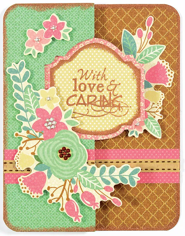 Cut 3 7/8"x2 7/8" of Emma’s Garden pink floral paper. Glue it centered on the front of the swinging label. Use a craft knife or scissors to cut the pink floral paper to fit the label. Use the package pattern to cut out a small label shape from Emma’s Garden ivory dot paper. Use VersaMark™ to stamp “With Love & Caring” in the center of the label. Sprinkle with copper embossing powder, tap off the excess and set with a heat gun. Ink the edges of the label with VersaMark™ ink and a cosmetic sponge, and copper emboss.