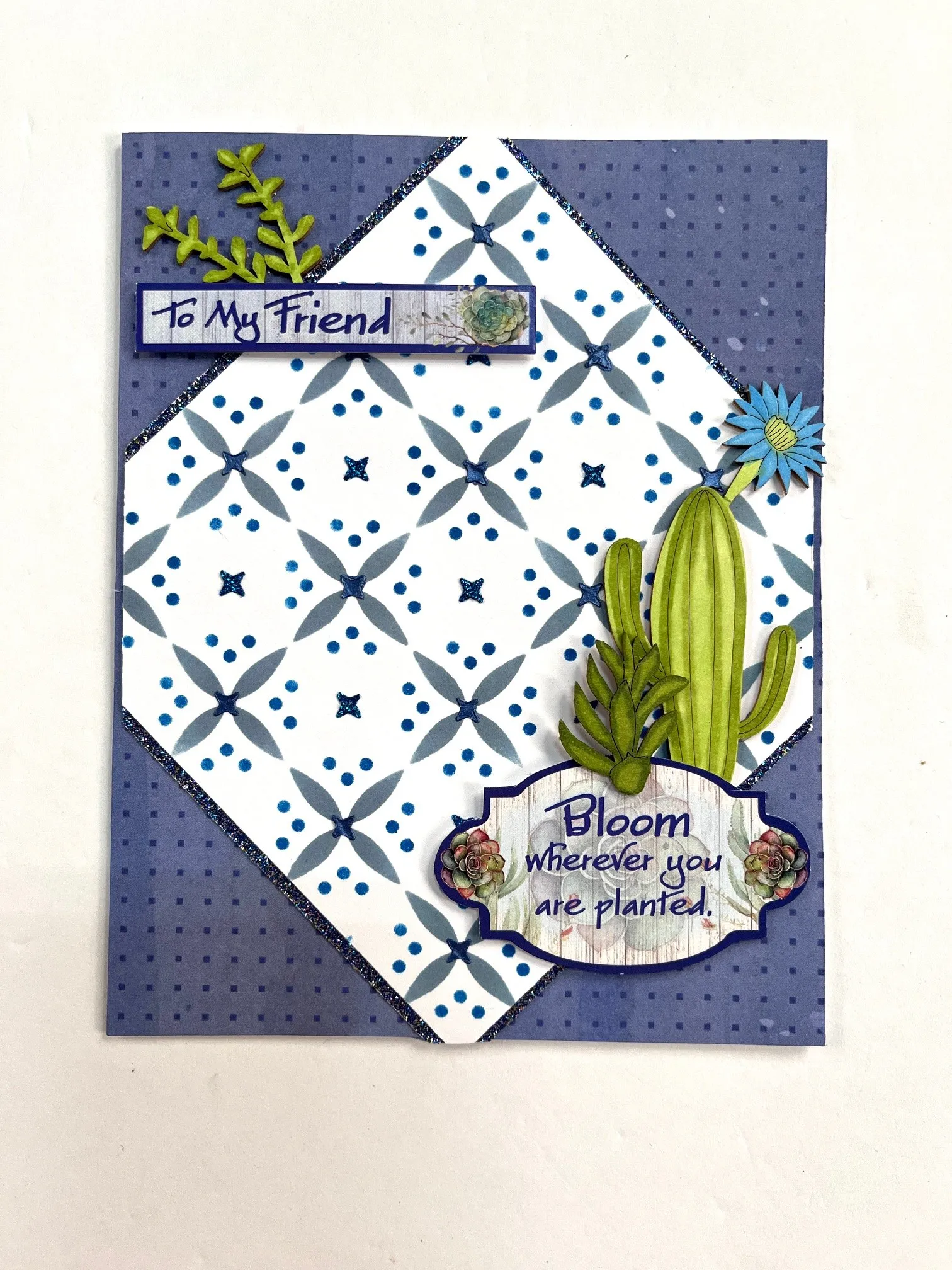 Cut the piece to 4 5/8”x4 5/8”. Mat on Blue Glitter Mix Cardstock. Place On Pointe on the card. Trim the edges.