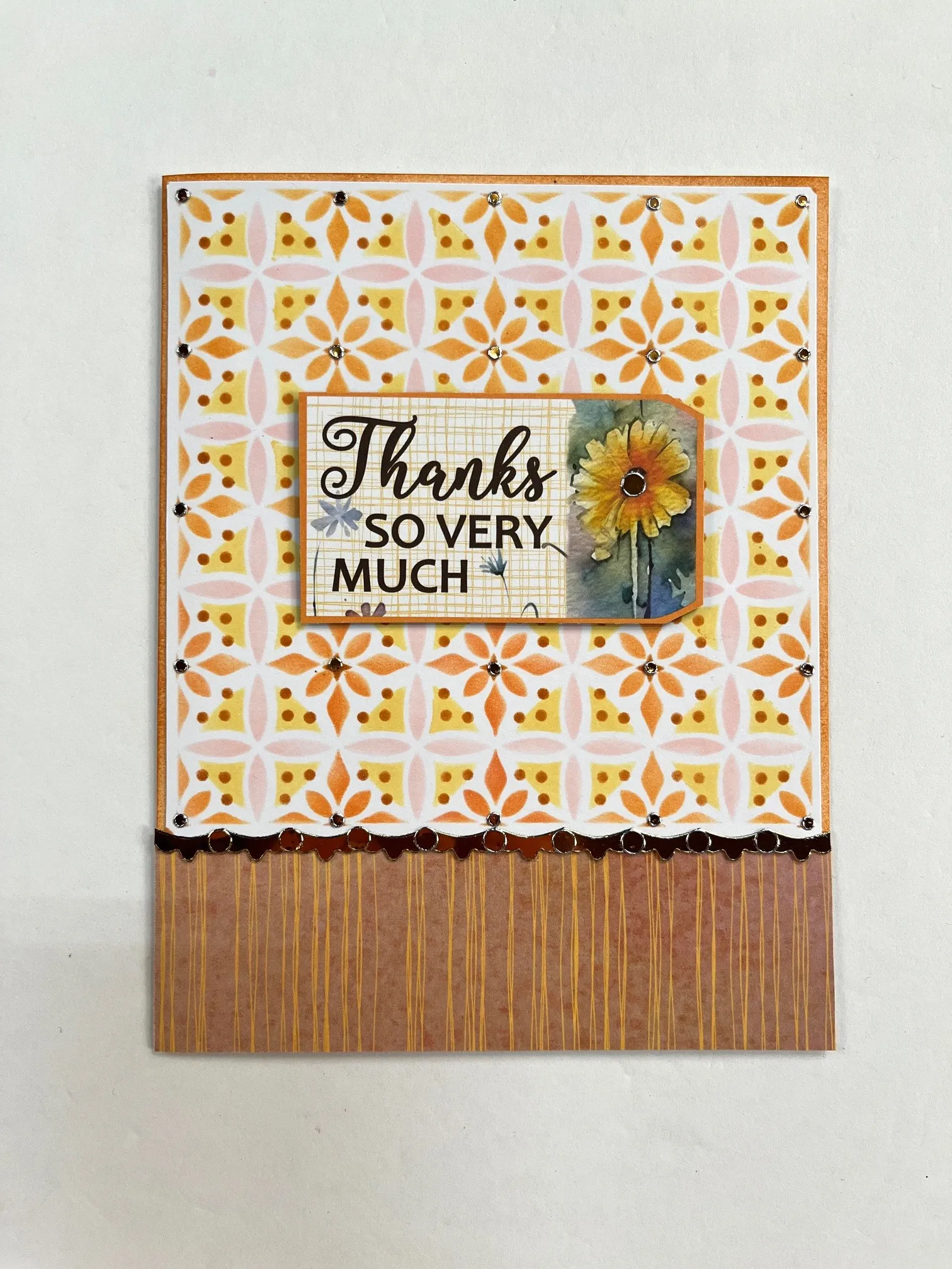 Ink the edges of the card using Roasted Pumpkin and trim stenciled cardstock into a square and glue to the card as shown. Glue Watercolor Wildflowers strip paper across the bottom and embellish with Copper Jewel Dazzles Border and Jewel Dazzles.