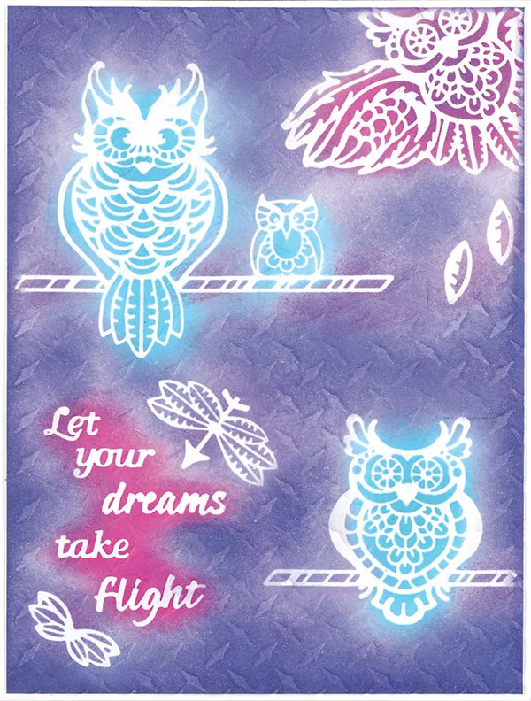Card front: Place your card with the fold on the left. Cut a piece of white cardstock to 4 3/4"x6 3/8". Peel off the Dazzles™ flying owl and place it on any fabric (your clothing works) or your hand, and remove it a couple times to weaken the adhesive (you'll be removing it from the card after sponging on the ink). Place the flying owl in the top right corner of the cardstock piece, extending off the cardstock as shown. Do the same with the other owl Dazzles&trade,; placing them as shown. For the owls sitting on the branches, cut the “branch” (border Dazzles™) and place on either side of the owls.