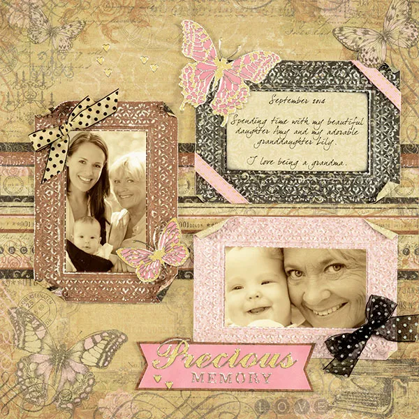 Photos: Cut three 5 3/4"x4" papers from On Butterfly Wings brown dot, pink floral, and black flourish papers. Use the Lay Frame folder to emboss each paper. Use a sanding block to lightly sand the raised designs on each. Don't sand too hard, or you'll go through the paper. Scrape the blade of a craft knife across the cut edges of the rectangles to rough up the edges a little. Cut a 2 1/4"x4" vertical photo and glue to the center of the brown dot frame. Roll up the corners with your fingers. Foam tape the framed photo to the page, 1" from the left and 3" from the top. Glue a 4"x2 1/4" horizontal photo in the center of the pink floral frame. Roll up all corners except for the bottom left. Foam tape this photo to the page 3/4" from the right and 1 3/4" from the bottom.