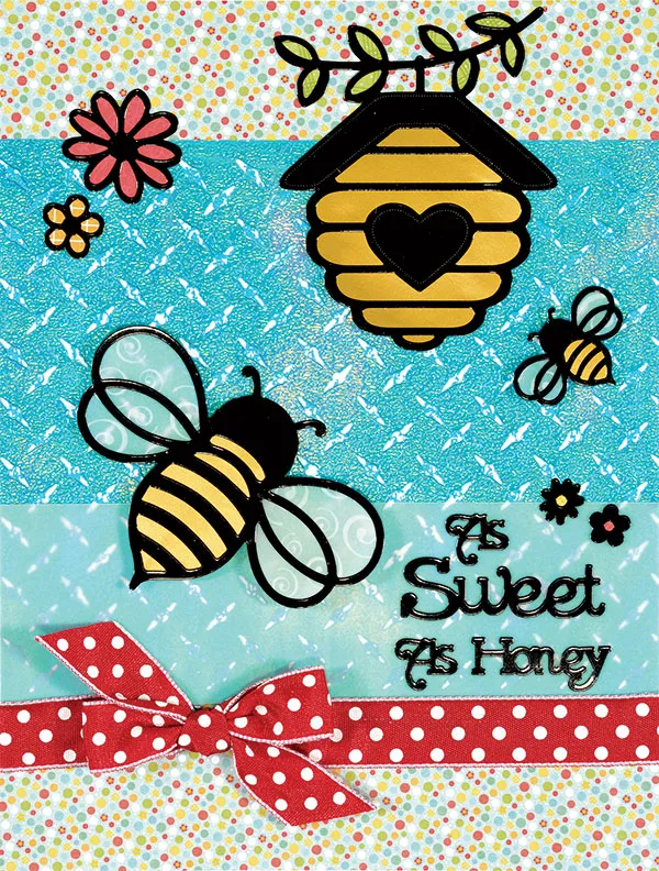 Cut 6" of red dot ribbon. Cut another 7 1/2" of the ribbon and tie a small bow, leaving the knot slightly loose. Thread the first piece of ribbon through this knot, and then tighten the bow, sliding it toward the left side (as shown on card). Use Zips™ to adhere the ribbon across the card, just below the vellum strip, and trim any excess. Place a hanging beehive Dazzles™ on gold metallic paper and cut close around the Dazzles™ edge. Back the leaves with Hopscotch green plaid paper, and glue to the upper right as shown. Back a large bee with gold metallic paper for the body and swirls vellum for the wings. Foam tape the bee’s body on the left as shown. Back a smaller bee the same way, and foam tape to the lower right of the beehive. Back 2 medium flowers with Hopscotch orange grid and red patterned papers, and glue to the upper left corner. Place "As Sweet As Honey" on the right side of the vellum strip. Back 2 small flowers with Hopscotch yellow and red papers, and glue to the upper right of the greeting as shown.