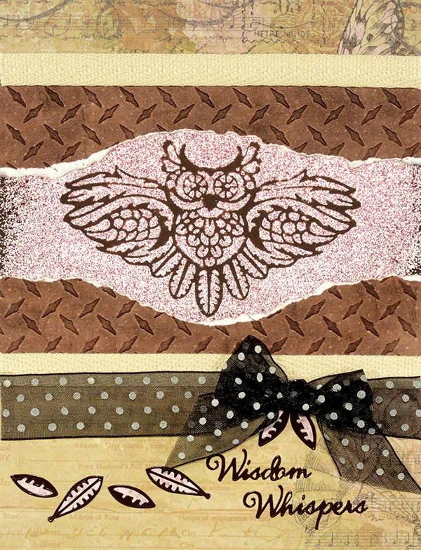 Cut 5"x3 1/4" brown cardstock. Peel off the flying owl Dazzle, and remove some of the stickiness by placing and removing it from fabric or your skin. Place it centered on the brown cardstock. Sponge VersaMark™ ink all over the owl and surrounding cardstock. Carefully peel off the owl without touching the area underneath it. Sprinkle with Rose Opaque and Zing! Gold Glitter embossing powders, and shake off the excess. Set with a heat gun. Glue the piece to the card, 1" from the top. Glue the two embossed brown strips from Step 1 above and below the owl, as shown. Use Zips™ to adhere cream twill ribbon along the top edge of the upper brown embossed strip, and along the bottom edge of the lower strip. Tie a bow with black sheer dot ribbon. Cut a 6" piece of the same ribbon and thread through the back of the knot in the bow. Adjust the bow as necessary, positioning it toward the right end. Use Zips™ to attach to the card, slightly overlapping the bottom twill strip, and trim any excess ribbon. Place "Wisdom Whispers" Dazzles™ below the bow as shown. Place 6 feathers onto On Butterfly Wings pink floral paper and cut close around the Dazzles™ edge. Glue 2 just under the knot of the bow, and the other 4 along the bottom of the card, as shown.
