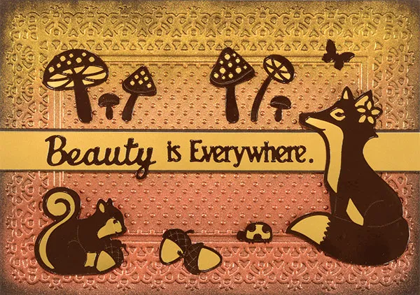Cut 5 7/8"x1/2" gold metallic paper and mat the long edges on brown cardstock with 1/32” borders. Foam tape across the center of the card. Place the fox Dazzles™ on gold metallic paper, and cut close around the Dazzles™ edge. Foam tape to the right side as shown, overlapping the strip. Place "Beauty is Everywhere" Dazzles™ on the strip to the left of the fox as shown. (You can add a period by using one of the mushroom innies.) Back all the rest of the Dazzles™ shown (squirrel, acorns, etc.) with gold metallic paper. Foam tape the squirrel on the bottom left and the ladybug to the left of the fox's tail. Glue 2 acorns overlapping in the bottom center. Glue the mushrooms above the strip, and place additional tiny butterfly and mushroom Dazzles™ as shown.