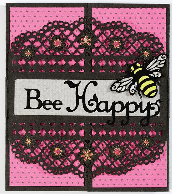 Cut an 11½”x1¼” black cardstock. Glue the die-cut centered on the strip. Wrap around the card, and glue the overlap at the back.