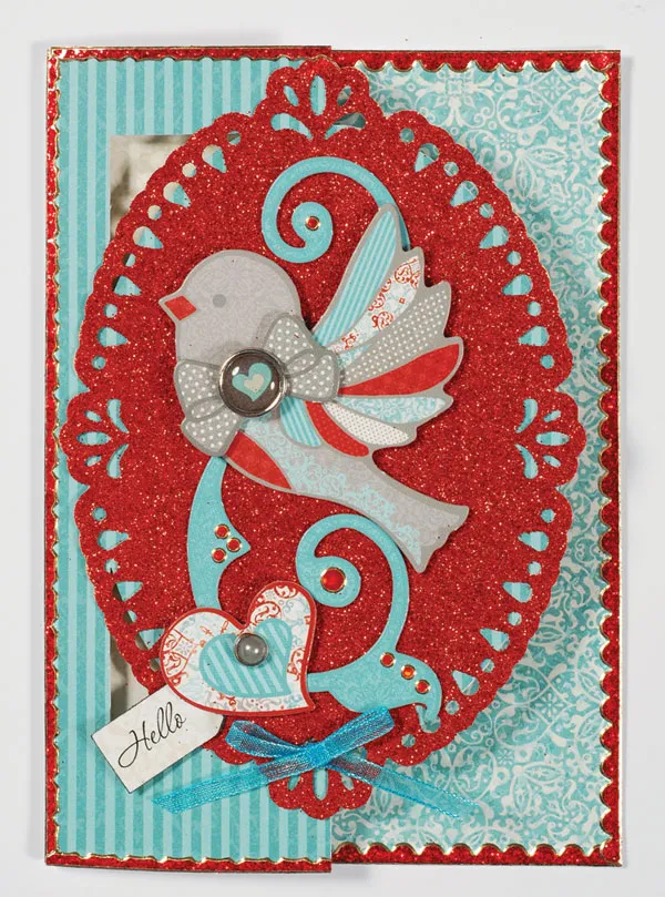 Punch out a blue swirl, large bird, gray bow, and blue/red heart die-cuts. Glue the blue swirl centered on the embossed oval card layer with the larger swirl on the bottom as shown. Foam tape the gray bow die-cut near the bird’s head, then add an Embellies™ brad on the center of the bow. Foam tape the bird die-cut on the swirl as shown. Write or computer print “Hello” on Robin’s Red ivory frillies paper and trim into a small tag shape. Ink the edges black and glue angled on the lower card front as shown. Add a small gray brad centered on the blue/red heart die-cut and foam tape it overlapping the blue swirl and tag. Decorate the blue swirl die-cut with Red Jewel Dazzles™. Use 1/8” wide blue sheer ribbon to tie a bow. Zot™ the bow on the bottom of the embossed Card Layer.