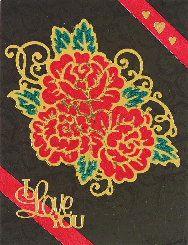 Die cut the roses from the gold mirror sheet. Since every die-cutting machine is different, you will need to experiment a bit to find what combination of mats/plates will allow you to cut through the mirror paper, which is a plastic-like material. I've found that I need a rigid surface (metal sheet) on the cutting side of the die to cut all the way through. I used an electronic die cutting/embossing machine and I placed the die blades up, mirror paper (gold side down), then a thin lightweight metal sheet, and then the top clear cutting platform. Once you've die cut out the roses successfully, remove the innies (a craft pick or craft knife helps). Die cut out the roses from red suede and try to remove it from the die with the innies intact (you'll be gluing these to your card). Cut out the roses from green suede and remove from the die (trying to keep the innies intact if possible).