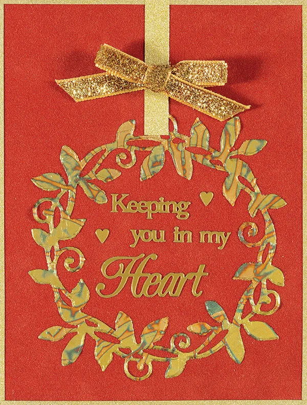 Front: Place the card with the fold on the left. Cover the card with Sienna Suede Paper. Trim 1/8" strips of gold pearl self-adhesive material and place around the card edges, trimming to fit. Die cut a wreath from double-sided adhesive and peel off one side of the backing. Place the wreath sticky side-up on scrap paper. Apply the Variegated Metal Leaf, pressing it firmly onto to the adhesive with your fingertips. Rub Scoochy Foam over the wreath to remove the excess leaf. Peel off the other side of the backing and press the wreath onto the card, centered 1/2" from the bottom. Cut 3/8"x2 1/4" gold pearl material and place it extending from the wreath to the top of the card (so it appears to be hanging). Tie a gold glitter bow and Zot™ it to the gold pearl strip as shown. Place the Dazzles™ greeting and hearts in the center of the wreath as shown.
