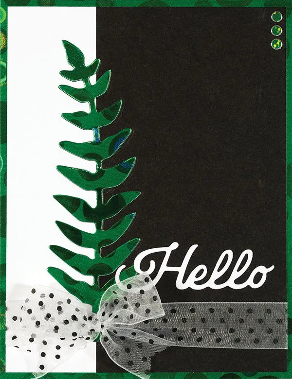 Tuck the ends of two lengths of sheer black dotted ribbon under the sides of the cardstock, ½” from the bottom, tying a bow over the fern. Die-cut “Hello” from white cardstock and glue in place above the ribbon. Place Jewel Dazzles™ at the top right corner, as shown.