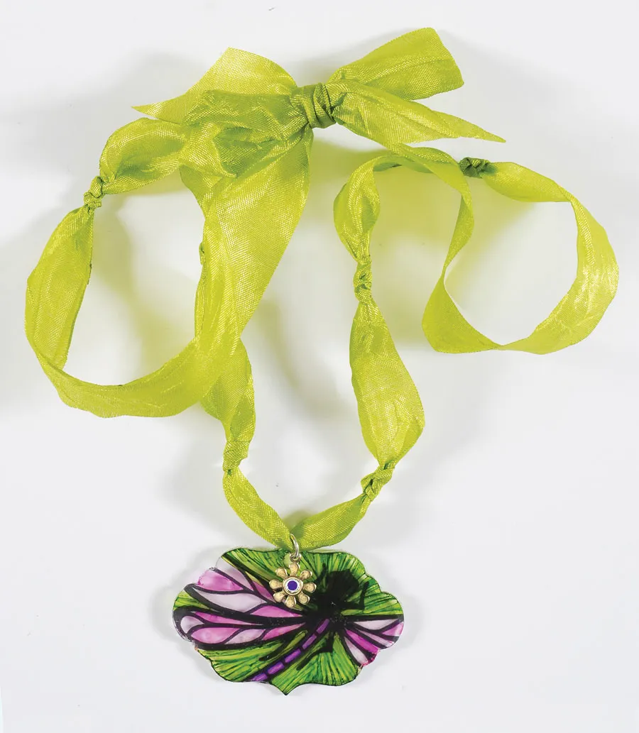 Cut an 18” length of 3/4” green Penelope ribbon and thread the charm onto it. Knot the ribbon six times, leaving 2” between each knot.