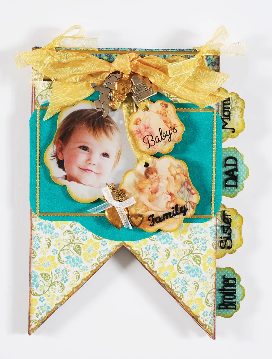 Cut out a 1.15” wide u-cut artwork, journal “Baby’s” on the lower area. Cut out one 1 79” wide artwork. Paint small details of the artwork with Smooch® Inks and let dry. Adhere the charms as in step four and let dry. Sand, then ink edges gold.