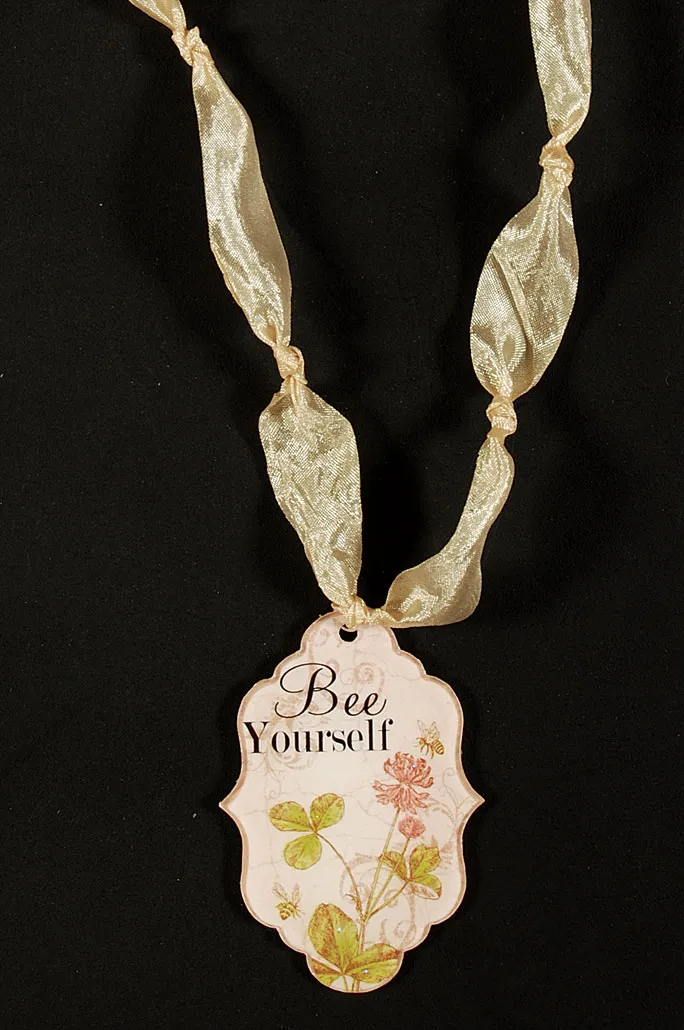 Remove the protective backing from both sides of the charm. Place the “Bee Yourself” side up on your craft paper and cover the image with an even layer of crystal lacquer. Place the charm on top of the lacquered image and wiggle slightly to disburse any air bubbles. Allow the lacquer to ooze out of the sides and let it dry without disturbing.