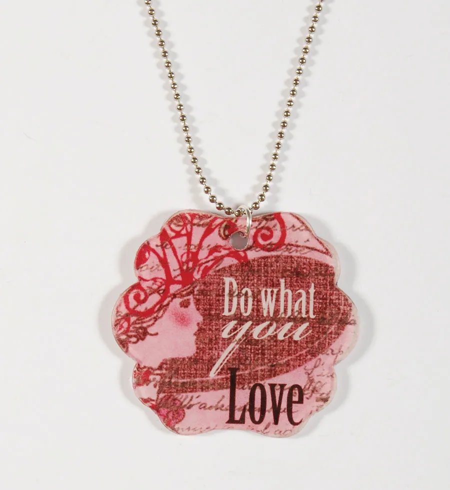 Cut out the “Do What You Love” Easy Peasy artwork and the “Always…” bird Easy Peasy artwork and glue back to back. Place the 1.79”x1.64” acrylic charm over the “Do What You Love” side and trace around the outside edges, and the inside hole. Remove the charm, cut out along traced lines and a punch hole on the traced hole area. Sand edges on both sides.
