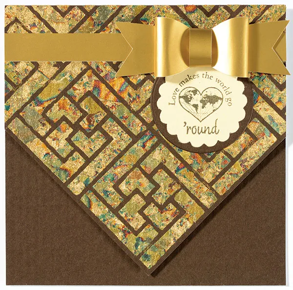 Die cut a 1 5/8” scalloped circle from ivory cardstock and stamp "Love makes the world go 'round" in the center. Die cut a 1 7/8” circle from brown cardstock and glue the ivory circle to the center. Glue to the card just below the gold metallic bow as shown.