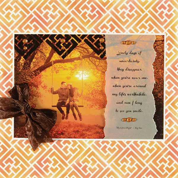 Embellishing: Place orange bling on the woven lattice design on the photo, and at the top and bottom of the journaling as shown.