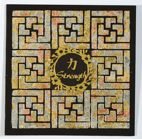 Foam tape 1 7/8” square of black cardstock to the square center. Place Far East Dazzles™ flower wreath and “Strength” on the center of the black cardstock square.