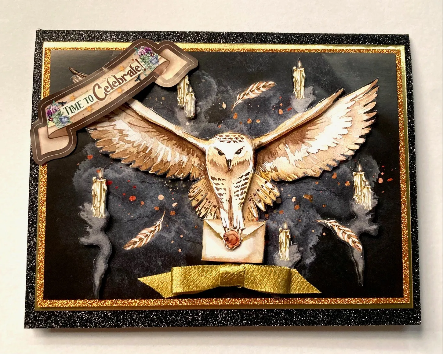 Cut out many layers of the identical Little Book owl pages and layer with foam tape. Trim out the "Time to Celebrate" sentiment and foam tape the center over the wing. Zot™️ the ends. Make and Zot™️ a 2" wide bow below the owl.