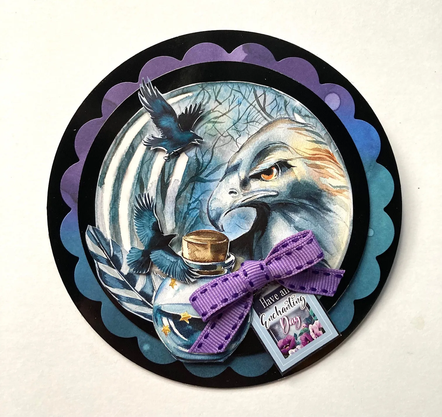Die cut the next straight edge circle and foam tape to the Flowing Ink scalloped circle. With the next smallest straight edge circle cut the eagle image. Use the scissors to trim out the feather, crows and ink well. Foam tape onto the owl image. Trim out the "Have an Enchanting Day" tag and glue as shown. Make and Zot™️ a 2" wide bow as shown.