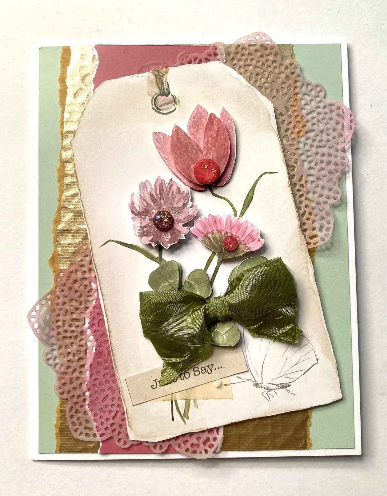 Die cut two round doilies out of vellum and use a blender brush to apply plum jam and rustic brown inks. Glue the inside areas that will be covered by the tag in the top right and lower left corners. Cut out the tag image and foam tape over the doilies at a slight angle as shown. Cut out more layers of the same image and add the layers with foam tape. Place Diamond Sparkles on the flowers. Make and Zot™️ a 2" wide bow as shown. Cut out and glue the “Just to Say” greeting at the bottom.