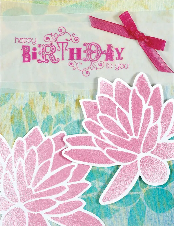 Place the water lily stencil on white cardstock and mist with Viva Pink Glimmer Mist. Cut out and glue to the bottom left corner. Repeat the water lily and foam tape to the right of the card as shown.