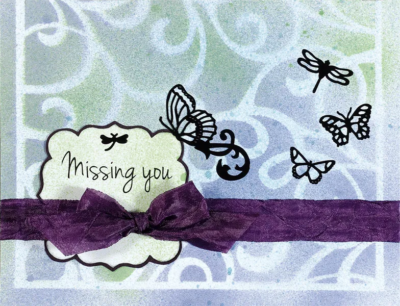 Adhere 6 1/2” of purple ribbon across the card with Zips™ adhesive lines, 1” from the bottom. Zot™ a bow over the greeting label as shown. Place Dazzle™ butterflies and dragonflies scattered around the card as shown.