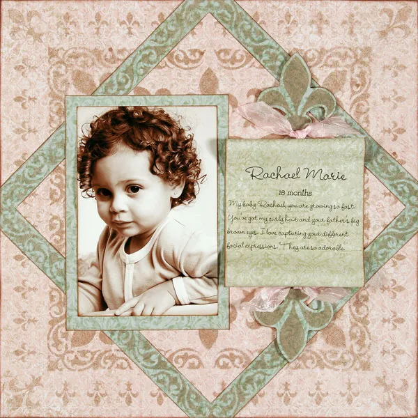 Cut out two fleur de lis shapes from the blue page and ink the edges. Foam tape above and below the journaling. Add a knot of pink ribbon above and below the journaling, adhering with Zots™ adhesive dots.