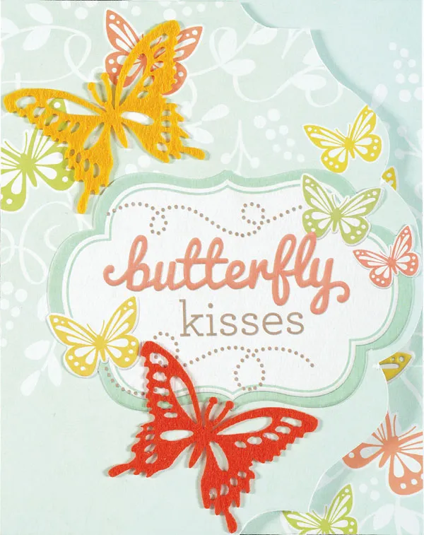 Glue the Simply Spring “Butterfly Kisses” die-cut to the 1st card front as shown. Glue butterfly stickers, and 2 Felt Butterfly shapes as shown.