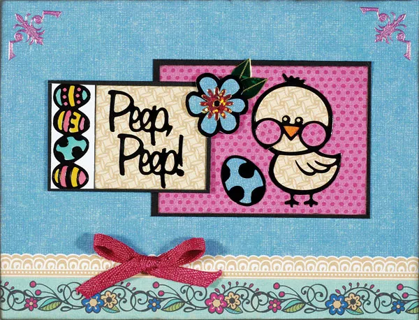 Place a length of the egg border on 3/4”x 1 5/8” white cardstock and color the eggs with Spectrum Noir Pens Turquoises BT4, Yellows CT1 and Pinks PP5. Ink the edges and glue to the left side of 2 1/2”x3/4” yellow weave paper. Mat on black cardstock with 1/8” borders and place “Peep, Peep!” Dazzles™ on the yellow weave paper as shown. Foam tape to the left side of the pink dot paper. Back a black flower Dazzles™ with blue paper and place a pink flower Dazzles™ at the center. Foam tape with leaves as shown. Use 1/4” wide pink Metallic ribbon to make a bow and Zot™ to the border as shown.