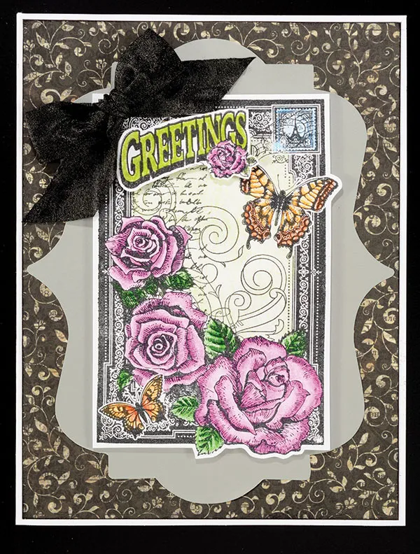 Outside: Place your card with the fold on the left. Cut 6 1/4"x4 3/4" On Butterfly Wings black swirl paper and ink edges black. Glue to the center of the card. Use the Design Tool Kit #8 to trace and cut a Delightful Label from Metallic Silver paper. Glue to the center of the card. Stamp the roses postcard onto white cardstock with black StazOn®. Stamp "Greetings" also on white cardstock. Color in the images using the Spectrum Noir™ Blendable Pencils set with the colors listed above (practice on scratch paper to match colors in the photo). Start with a light touch, and layer more color on to create deeper shades. Cut out the postcard leaving a 1/16" white border, and glue to the center of the card. Cut out "Greetings" and foam tape to the top left of the postcard. Glue a black crepe bow to the top left corner of the postcard as shown.