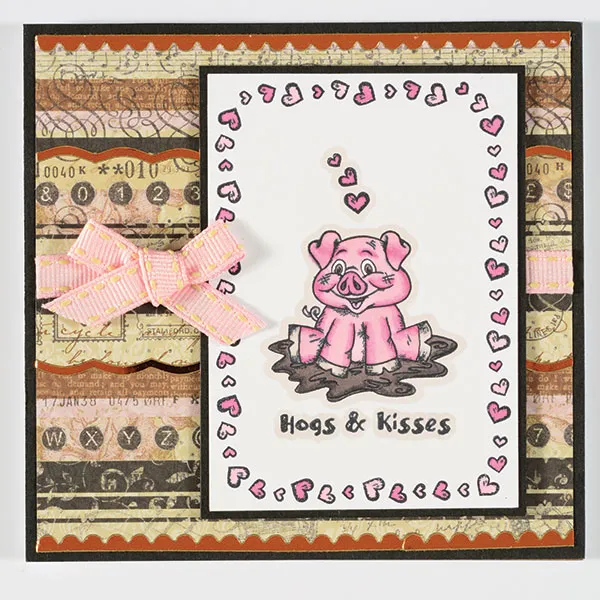 Trim the card down to 5" x 5". Cover the card with black cardstock. Cut 4 3/4" square On Butterfly Wings striped paper and glue to the center. Trim pieces of Copper Border Dazzles™ and place along the striped paper in several places, as shown. Glue 5" of pink grosgrain stitched ribbon across the card, 2" from the top. Cut 2 3/4"x4" white cardstock. Stamp the hog, hearts, and "Hogs & Kisses" in the center of the cardstock as shown. Stamp hearts around the piece, creating a border. Color in the hog and the hearts with PP5 & PP3. Color in the mud puddle and around the perimeter of the image and greeting with the Warm Grays colors listed above (test colors on scrap paper before using on image). Mat the image on black cardstock with a 1/16" border. Glue to the card 1/2" from the right and 1/4" from the top. Glue a pink stitched grosgrain bow to the left of the image, on the ribbon strip.