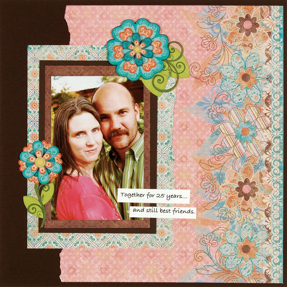 Place the peach page border at the bottom. Trim the paper to 11 1/2” wide and tear the top edge to measure 9 1/2” tall. Place the border on the right side and glue to the brown cardstock as shown.