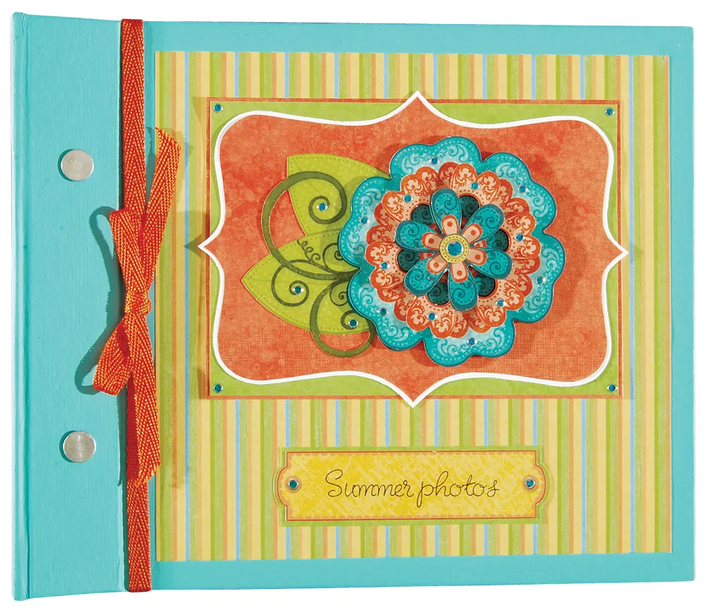 Cut out the yellow label, journal “summer photos&rdquo,; mat with green and glue below the flower. Tie a piece of orange ribbon around the spine with a bow.