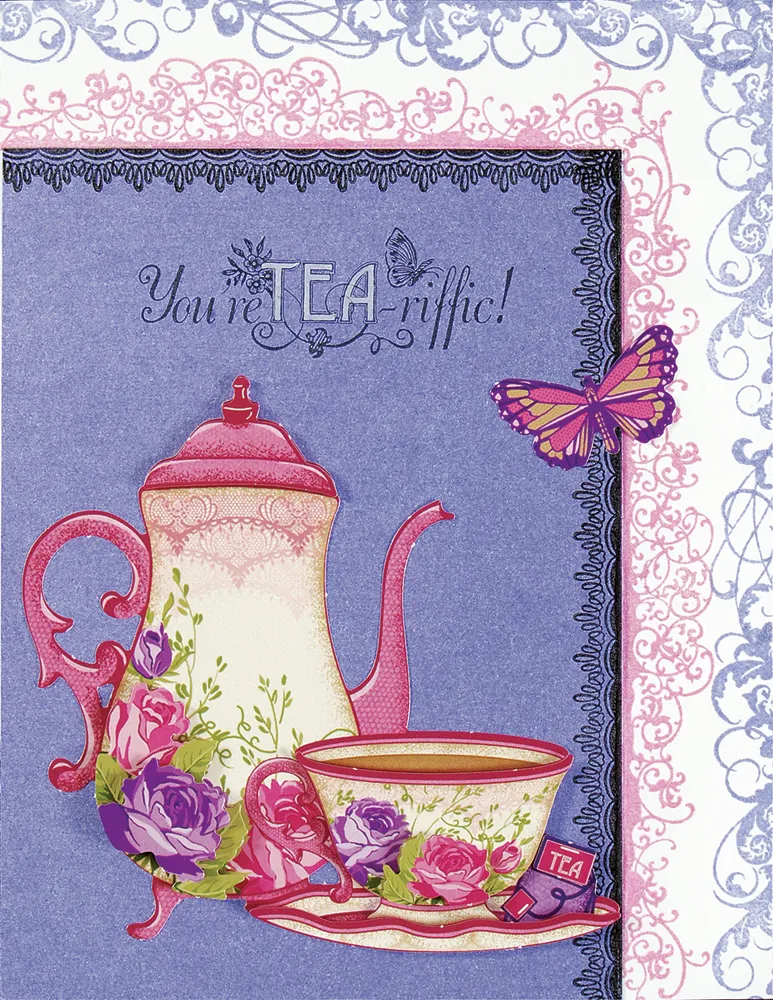 Assemble the teapot/teacup papier tole by following the instructions on the papier tole sheet. Glue the finished piece to the card 1/8" from the left and ¼" from the bottom. Punch out a butterfly and glue to the card along the right side, 2 ¼" from the top.