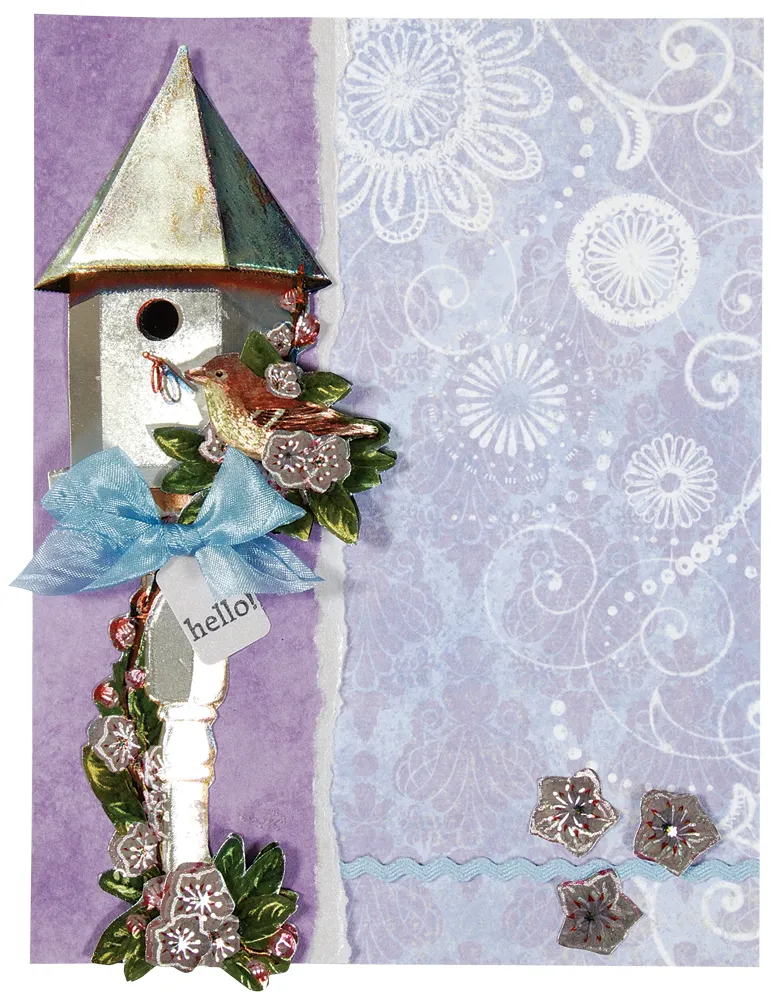 Punch out and assemble the birdhouse, as instructed on the Papier Tole sheet. Glue to the left of the card front. Punch a tag, stamp “hello!” and glue at the base of the birdhouse. Zot™ a ribbon bow to the top of the tag.