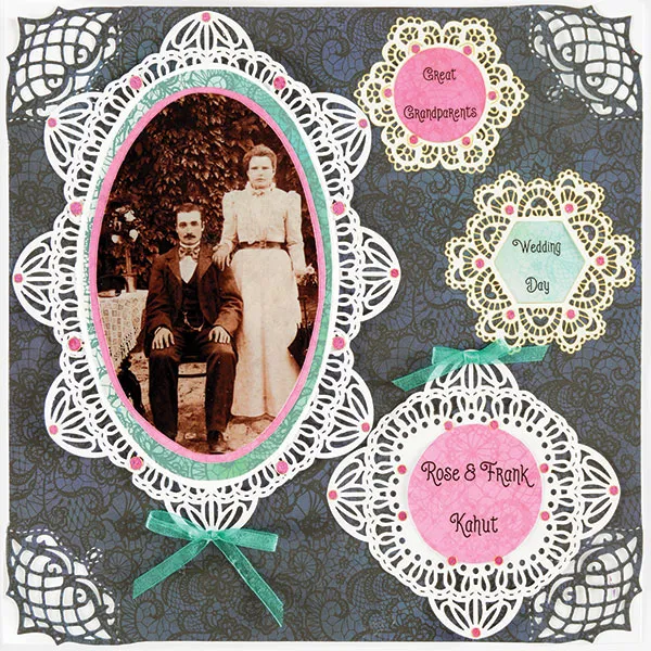 Use the Oval Template to cut a 4”x6½” photo. Mat on Painted Lace pink paper with 1/8” borders. Mat on Painted Lace teal lace paper with 3/8” borders. Glue to the white oval. Glue so the top die-cut, and the center left die-cuts are even with the page edges. Place Dazzles&trade,; and zot a ribbon bow as shown.