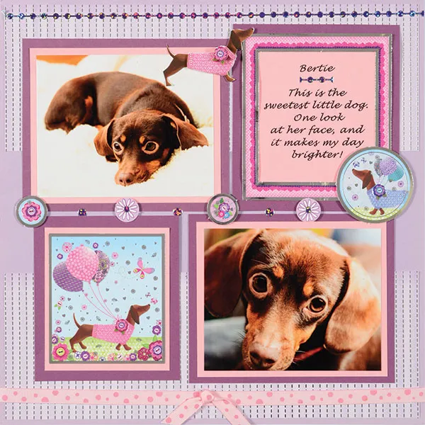 Write or computer journal on 4”x4¼” pink cardstock. Place the frame from the “Make a Wish” paper around the journaling. Mat on dark purple cardstock with ¼” borders. Glue to the top right corner. Foam tape the dog circle and flower circles between the photos as shown.
