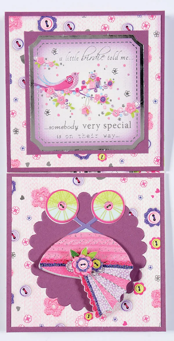 Cut two 4” squares of dark purple cardstock. Place glue only on the bottom of one of the scored sections on the card top. Glue only the bottom of the purple cardstock to the card top. Repeat for the other side. Cut two 3 7/8” squares from the Knit and Button Adorable Scorable papers. Glue to the purple cardstock, so the pattern is horizontal (it will twist when opened). Use the 3” scalloped cutting die to cut a purple cardstock. Glue to the left side centered. Assemble the Baby Buggy paper tole with foam tape, and glue to the circle, so the top is facing the left side. Glue a 3 1/8” square of purple cardstock to the right side centered. Glue the “a little birdie told me…” square centered, so the top is facing the right edge.