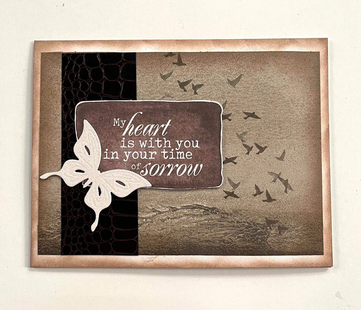 2. Use Velvet Fawn with the Blender Brush to color the edges of the card front. Cut 6”x4 3/8” brown birds In Loving Memory paper. Glue to the card front.
