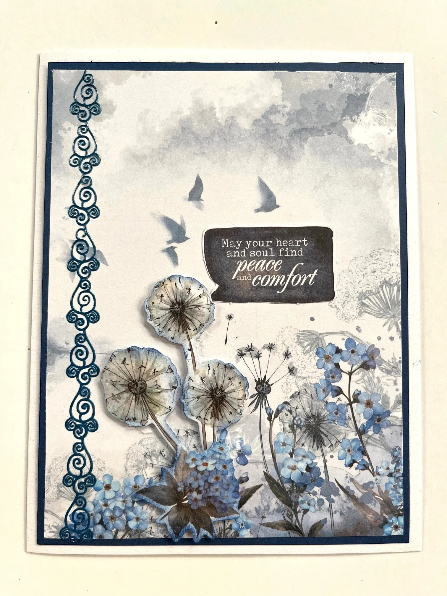 3. Inside: cut 4 ½”x5” light blue In Loving Memory paper and mat on dark blue with 1/8” borders. Glue inside the card. Remove the five Die-Cuts shown. Ink the two blue ones and glue overlapping as shown. Glue the dandelions and blue flowers a shown. Place blue Fancy Border Dazzles™ on the left.