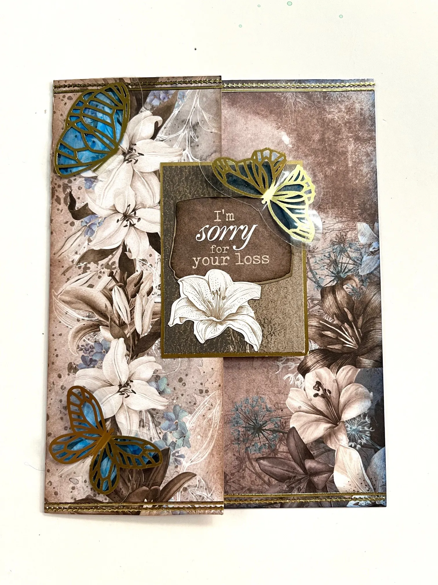 3. Cut 2”x2 ¾” brown In Loving Memory paper and mat on Metallic Gold with 1/16’ borders. Glue only the left side to the card front. Remove the “I’m sorry for your loss” die-cut and ink the edges with Velvet Fawn ink pad and a Blender Brush. Glue to the brown paper. Remove a white lily Die-Cut and glue as shown.