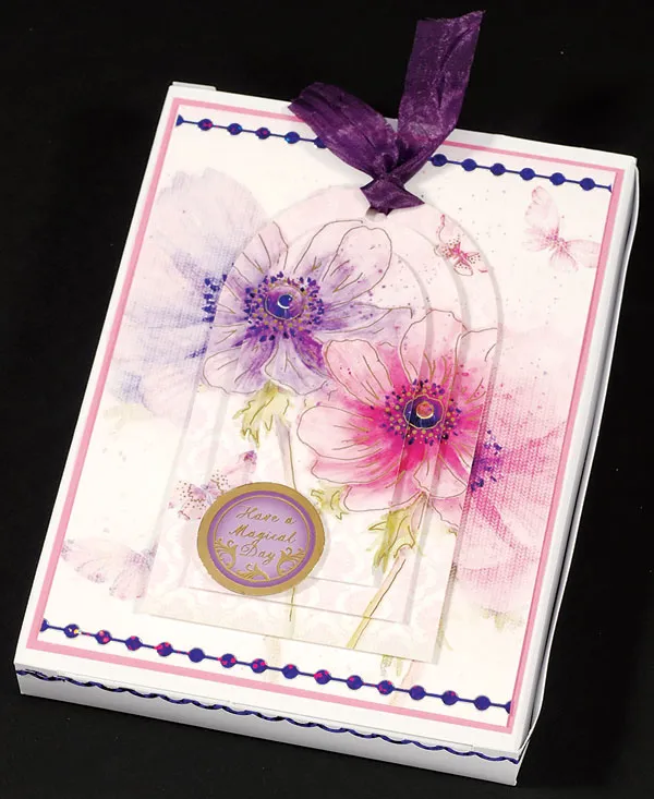 Layer the die-cut centers, from the arch windows and frame, with foam tape and embellish with Pink and Purple Jewel Dazzles™. Foam tape the die-cut circle greeting to the bottom left as shown. Punch ¼” hole at the top of the bottom arch. Thread with a length of 5/8” wide Gypsy Jewels purple crepe ribbon. Foam tape the tag to the box top as shown.