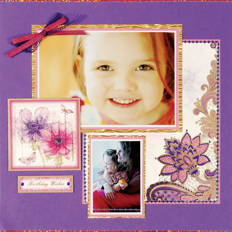Hold lengths of ¼” wide dark pink metallic and ¼” wide purple mesh Fancy Feathers ribbon, together to make a bow and Zot to the top left photo corner as shown. Assemble the Hunkydory Poppy Meadow square pyramid with foam tape then foam tape it to overlap the bottom left photo corner. Place Purple Jewel Dazzles™ on each side of the “Birthday Wishes” die-cut and foam tape below the poppy pyramid as shown.