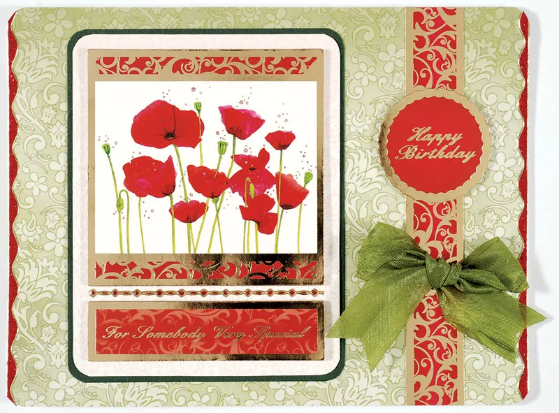Punch out the poppies rectangle with gold foiled borders from The Poppy Field sheet and foam tape on pale pink flourishes cardstock. Foam tape “For Somebody Very Special” below the first piece, with 3/16” space between the two. Trim around the two pieces as one, with 3/16” borders. Use the Corner Chompers or scissors to round the corners. Mat on dark green cardstock with 1/16” borders and round the corners. Glue centered on the card front, 3/4" from the left side. Align one end of the red/gold foiled border with the top edge of the card and glue in place, 3/4" from the right side. Trim the bottom edge evenly with the card.